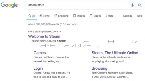 Сообщение «Fuck Epic Games Store» (мягко: «В топку Epic Games Store») появлялось в англоязычном гугле под описанием магазина Steam по поисковому запросу. Поначалу подобное даже казалось закономерностью, ведь два этих игровых магазина уже давно ведут ожесточенную вражду.
