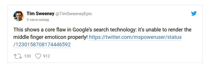Глава Epic Тим Свини тоже отреагировал на произошедшее, съязвив по поводу несовершенства поисковой системы: по его мнению, сообщение должно идти вместе с изображением среднего пальца.