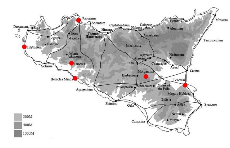 Ареал распространения второго рабского восстания на Сицилии. Красным отмечены города, захваченные повстанцами.