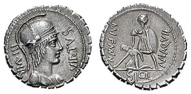 Римский денарий 71 года до н. э., отчеканенный Манием Аквилием, внуком консула 101 года до н. э. в память о деяниях своего предка. На одной стороне монеты изображено олицетворение доблести (virtus), на другой — сам Маний Аквилий, поднимающий с колен измученную рабским восстанием Сицилию.