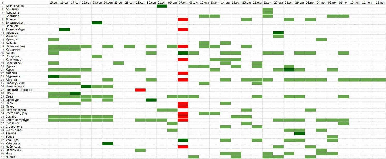 Обозначения на таблице: зеленая светлая метка — где были разрешения на митинг, зеленая темная — где Навальный принял участие в разрешенном митинге. Красная метка — состоялся несогласованный митинг.