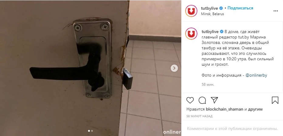 В доме, где живет главный редактор tut.bу Марина Золотова, сломана дверь в общий тамбур на ее этаже. Очевидцы рассказывают, что это случилось примерно в 10:20 утра, был сильный шум и грохот, — говорится в сообщении.