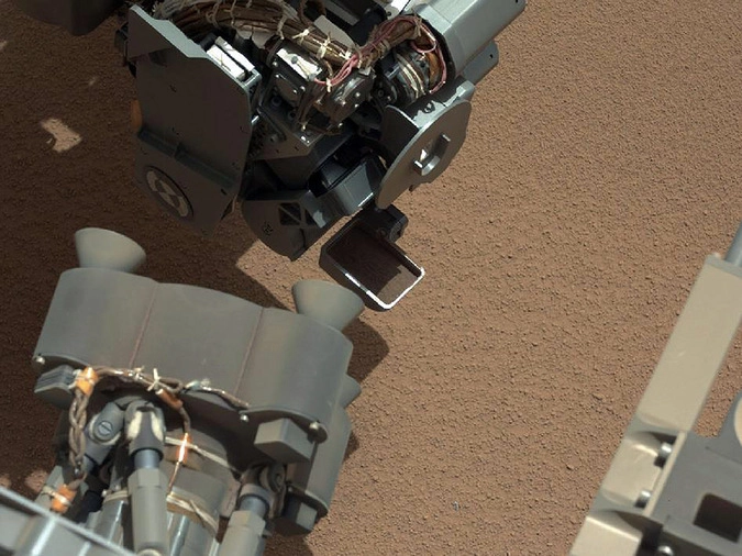 На фото, сделанном камерой на мачте марсохода, виден специальный совок, наполненный песком и пылью с поверхности планеты и готовый переместить свое содержимое в резервуар. Чтобы был понятен масштаб, NASA указывает, что размер совка – 7х4,5 см.