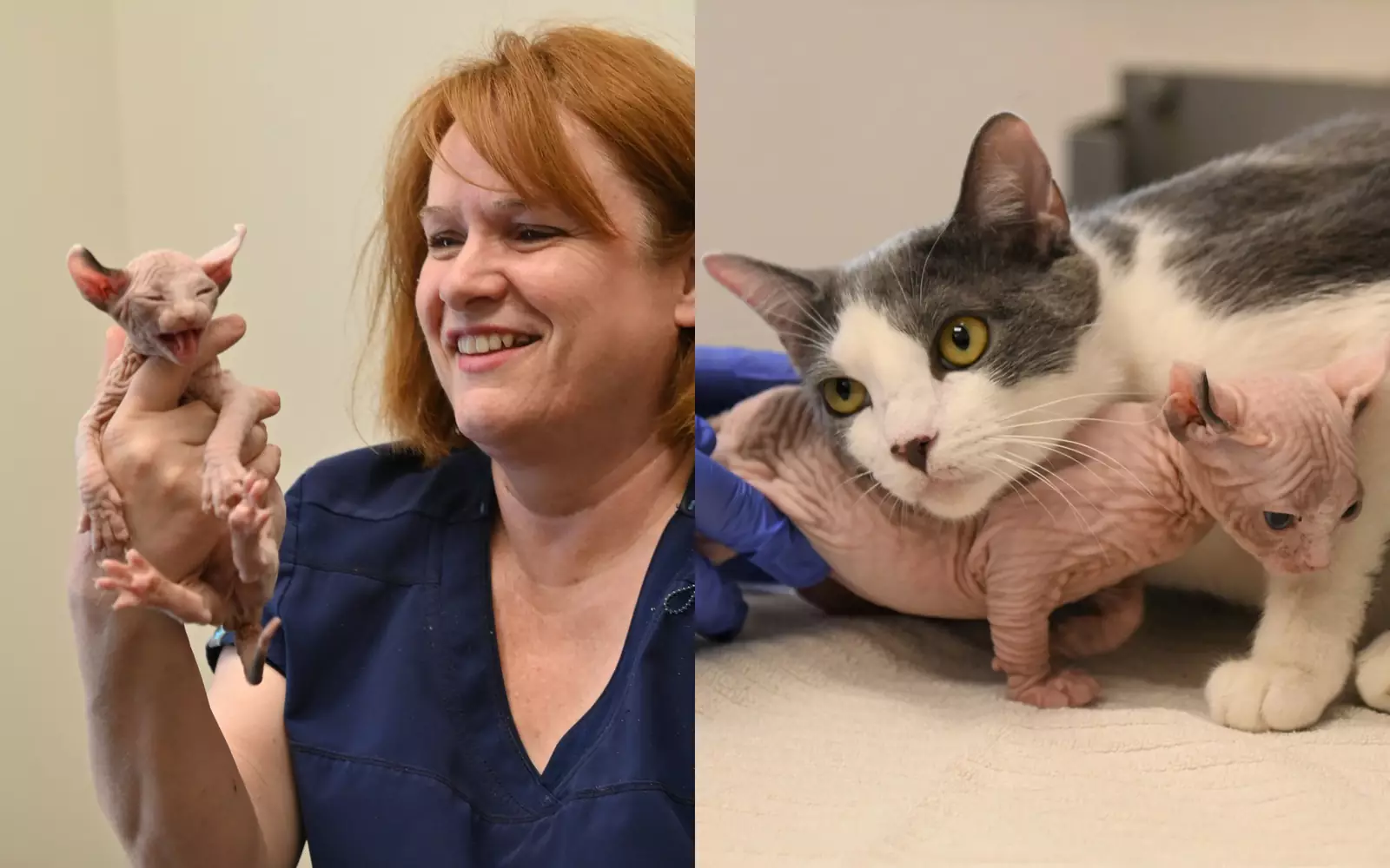 Заботливая кошка приняла в свою семью новорожденного сфинкса, отвергнутого матерью