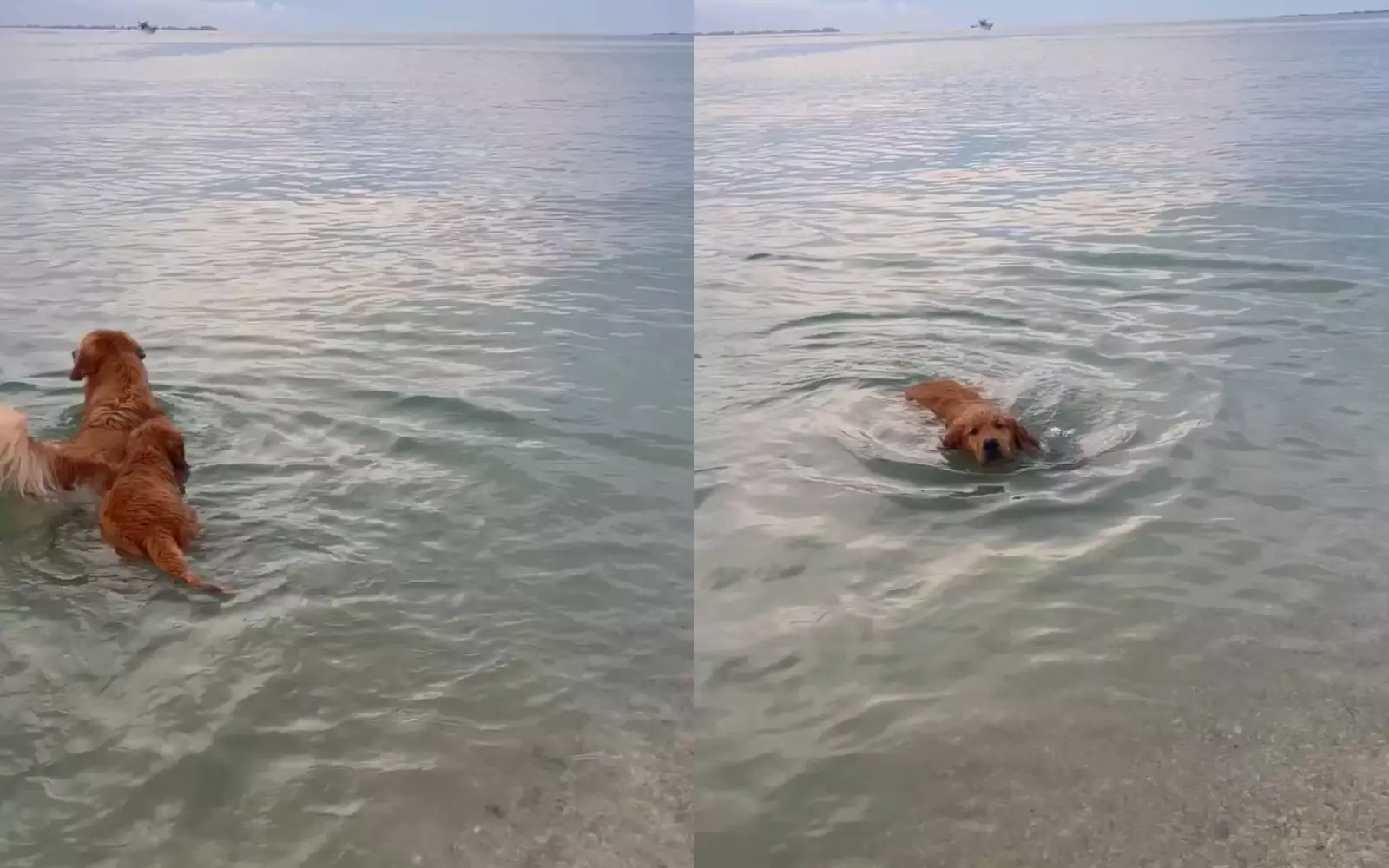 Заботливый пес помог младшему брату преодолеть страх и научиться плавать