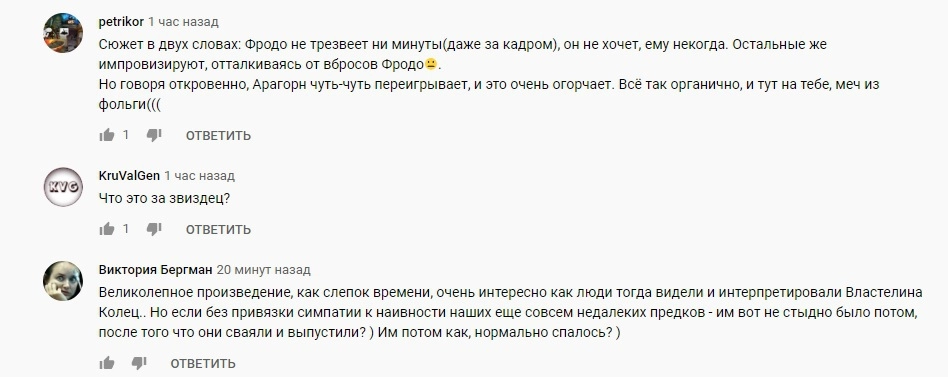 Радостно было сниматься. Тогда Толкин стал для нас открытием целого нового мира. Может быть, сейчас все это смотрится примитивно технически, может быть, кто-то будет ругать, — добавил Валерий Дьяченко, воплотивший на экране образ Фродо.