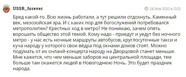Чиновник пояснил, что решение закрывать метро в ночное время власти приняли для того, чтобы не искушать жителей. Он также призвал граждан увидеть в сложившейся ситуации позитивные моменты. Например, проведение традиционного концерта на Дворцовой площади в ночь с 31 декабря на 1 января, которое в этом году пройдет в формате онлайн, даст артистам новые возможности проявить себя.