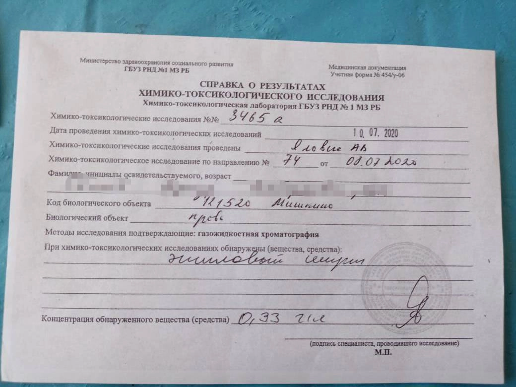 Вскоре после этого с Ларисой Салиевой связался мужчина, в сентябре тоже столкнувшийся с оригинальными результатами экспертизы. Его сын сорвался с турника, играя на оборудованной детской площадке, а в справке из республиканского наркодиспансера также указано, что в крови мальчика был обнаружен алкоголь. По обоим несчастным случаям экспертизу выполнял один и тот же специалист.