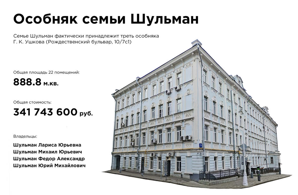 Центр Навального разместился в помещении у скандально известного в столице блогера Михаила Шульмана: в Сети есть множество расследований о том, как председатель ТСЖ Шульман, работая дворником, завладел несколькими квартирами и офисами. Согласно опубликованным данным, на Шульмана и членов его семьи записано порядка 888 квадратных метров в одном доме, стоимостью более 340 миллионов рублей.
