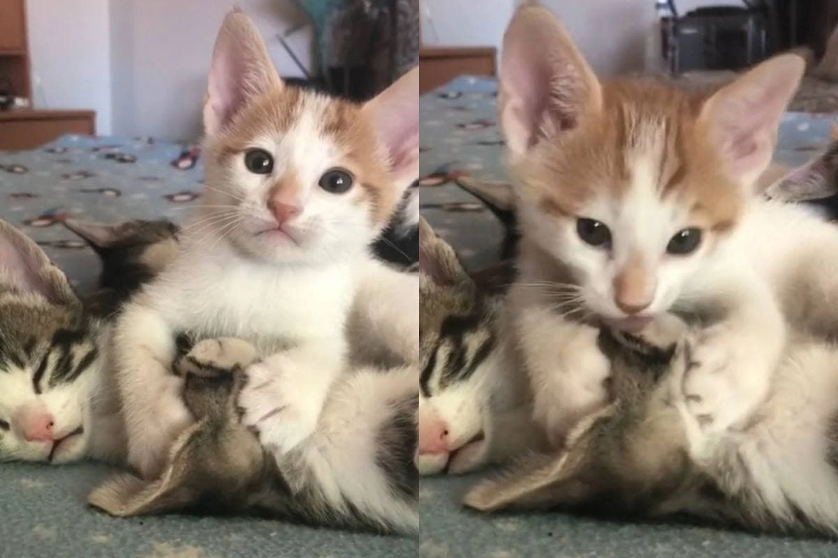 Котята из другого ролика удивили соцсети, атаковав свою хозяйку ради корма.