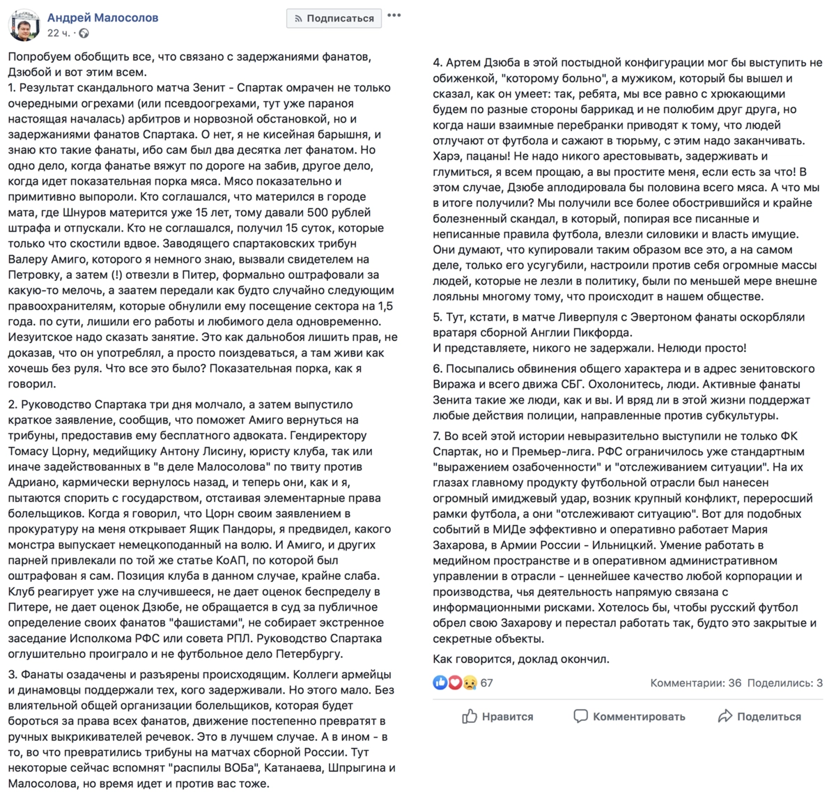 «Реакция РФС, РПЛ и клубов, в данном случае клуба „Спартака“, на эти события вызывают оторопь. „Спартак“ молчал три дня, а потом решил предоставить бесплатного адвоката, что сейчас себе может позволить абсолютно любой фанатский движ. Не было ни заявлений, ни созыва какого-нибудь чрезвычайного исполкома», — удивляется Малосолов.