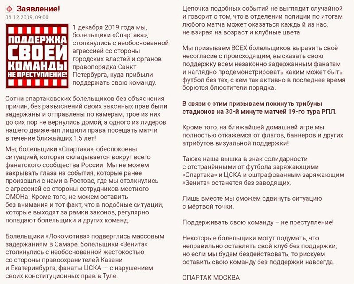 В сложившейся ситуации фанаты решили действовать по-своему. «Фратрия» — объединение болельщиков «Спартака» — призвала всех фанатов покинуть матчи 19-го тура РПЛ на 30-й минуте.