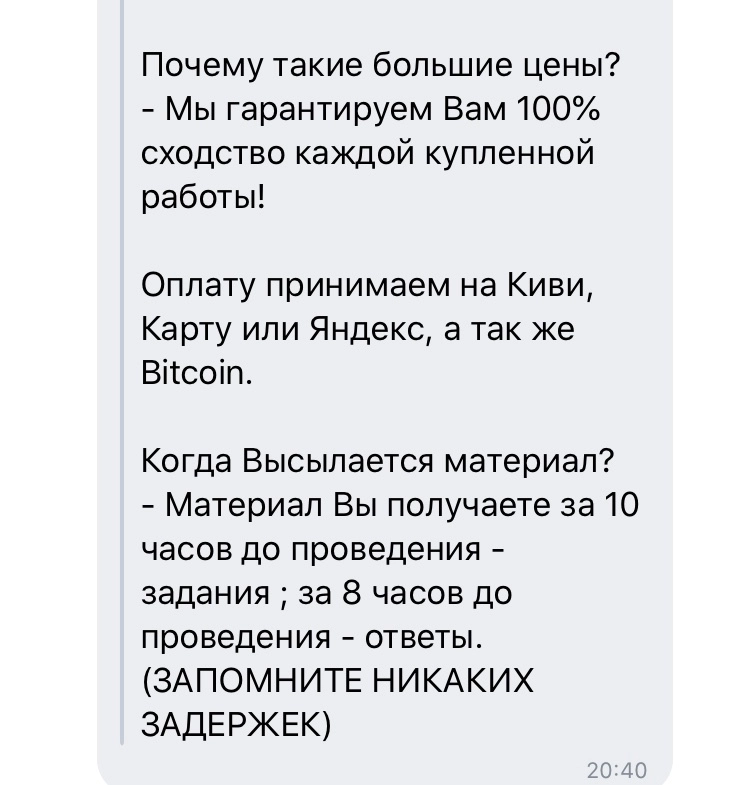 По словам Елены, ее сын — ученик девятого класса одной из московских школ, готовясь к региональному этапу Всероссийской олимпиады по экономике, обнаружил ряд групп в социальных сетях и Telegram-каналов, которые предлагают задания и ответы на продажу. Задания по русскому языку, обществознанию и другим предметам школьной программы стоят от трех до шести тысяч рублей. Число подписчиков таких групп доходит до семи тысяч.