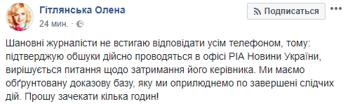 «Уважаемые журналисты, не успеваю отвечать всем телефону, поэтому: подтверждаю, обыски действительно проводятся в офисе РИА Новости Украина, задержан его руководитель. Обоснованную доказательную базу мы обнародуем после завершения следственных действий. Прошу подождать несколько часов!» — написала она.