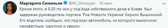 По данным агентства, утром возле собственного дома задержали другого журналиста местного филиала РИА — гражданина Украины Кирилла Вышинского. В украинских СМИ появилась информация, что ему может инкриминироваться статья «Государственная измена».