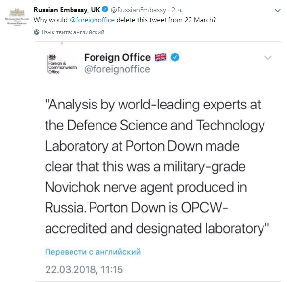 «Почему МИД удалил этот твит от 22 марта: „Анализ ведущих мировых экспертов лаборатории „Портон Даун“ показал, что нервно-паралитическое вещество „Новичок“ было произведено в России. „Портон Даун“ — лаборатория, аккредитованная Организацией по запрещению химического оружия“?» — говорится в сообщении российского диппредставительства.