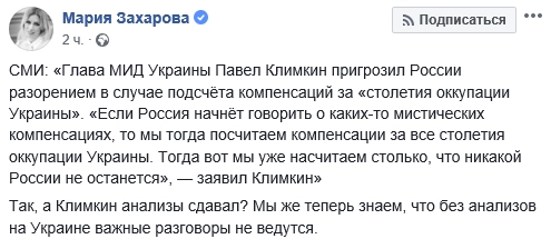 Официальный представитель МИД Мария Захарова в свойственной ей манере прокомментировала заявление министра иностранных дел Украины Павла Климкина о том, что Киев может потребовать компенсации за столетия «российской оккупации».