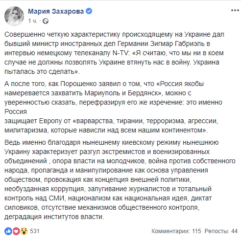 В своем обличительном заявлении Мария Захарова не обошла вниманием и недавние слова бывшего министра иностранных дел Германии Зигмара Габриэля, усмотревшего в действиях украинских властей попытку втянуть ФРГ в полномасштабную войну.