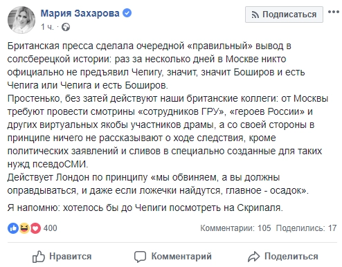 «Британская пресса сделала очередной „правильный“ вывод в солсберецкой истории: раз за несколько дней в Москве никто официально не предъявил Чепигу, значит, Боширов и есть Чепига или Чепига и есть Боширов», — написала российский дипломат в соцсети Facebook.