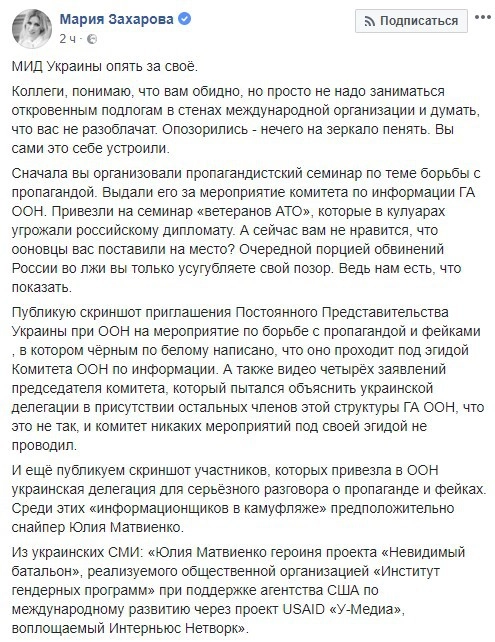 Официальный представитель МИД России Мария Захарова на своей странице в Facebook опубликовала доказательства того, что украинские власти организовали мероприятие на тему пропаганды и недостоверных новостей, заявив его как часть сессии Комитета ООН по информации.