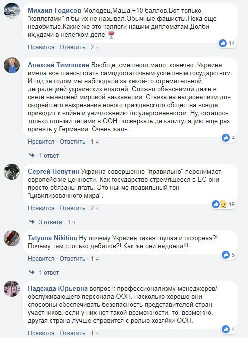 Кроме того, Захарова опубликовала видео четырех заявлений председателя комитета, который «пытался объяснить украинской делегации в присутствии остальных членов этой структуры ГА ООН, что это не так, и комитет никаких мероприятий под своей эгидой не проводил».