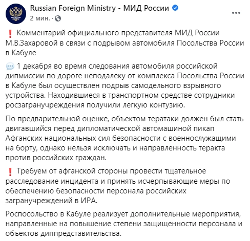 Во время следования автомобиля российской дипмиссии по дороге неподалеку от комплекса посольства России в Кабуле был осуществлен подрыв самодельного взрывного устройства. Находившиеся в транспортном средстве сотрудники росзагранучреждения получили легкую контузию, — сообщается на официальной странице дипведомства в Facebook.