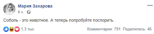 Соболь — это животное. А теперь попробуйте поспорить, — написала она в Facebook.