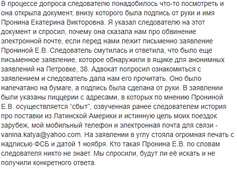 Оказалось, что в полицию поступило заявление от некой Прониной Е. В. Она сообщала правоохранителям, что Овчинников и его партнеры под прикрытием сети пиццерий занимаются распространением наркотических средств.
