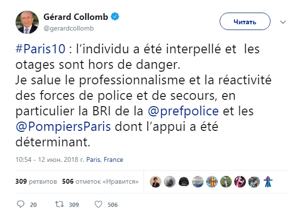 «Человек арестован, заложники уже в безопасности. Благодарю за профессионализм и отзывчивость полицию и всех, принимавших участие в операции», — написал он в своем Twitter.