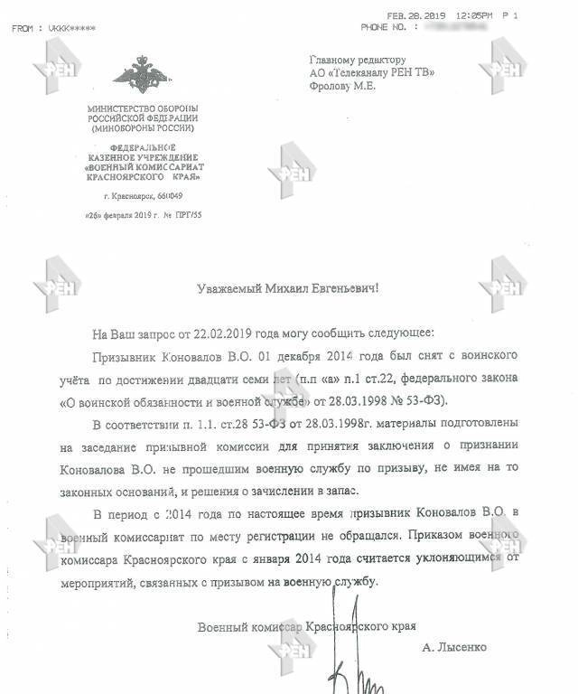 «До настоящего времени решение в отношении Коновалова В. О. о вынесении заключения о признании его не прошедшим воинскую службу по призыву, не имея на то законных оснований, и зачисления в запас не принято, в связи с неявкой его на заседание призывной комиссии. Извещение о заседании призывной комиссии по данному вопросу, направленное Коновалову В. О. почтовой связью, им не получено. Заявление на выдачу военного билета Коновалов В. О. не подавал, военный билет не получал», — говорится в ответе прокуратуры Красноярского края одному из местных ТВ-каналов.