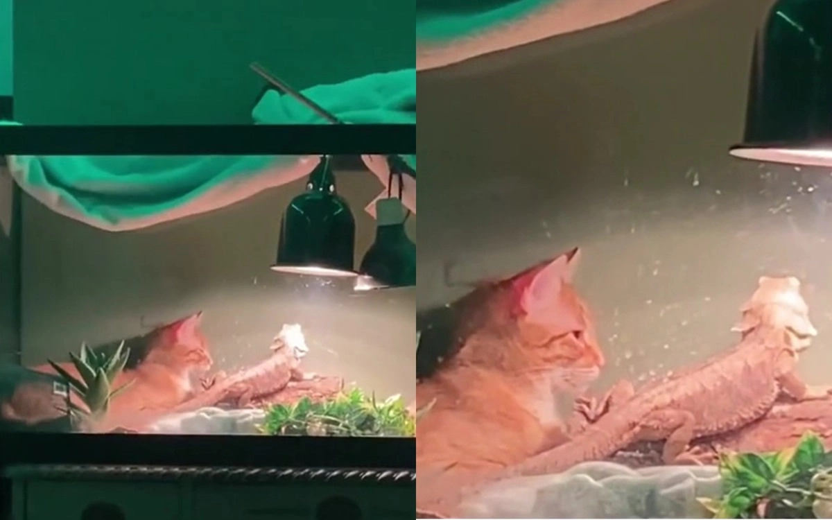 Пользовательница TikTok под ником alexistexaas опубликовала забавный и немного странный ролик со своим котом, который пришел в гости к ящерице, чтобы немного погреться под лампой. Котейка настолько замерз, что даже визит к недружелюбной рептилии показался ему отличной идеей.