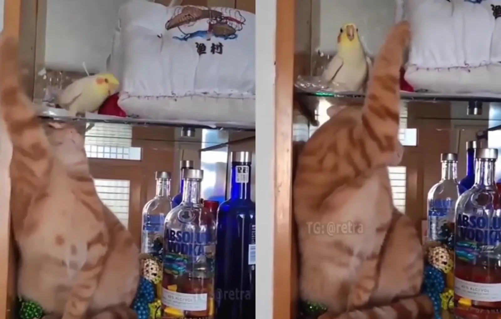 «Замолчи ты, пернатый!»: уставший от пения попугая котейка вышел из себя