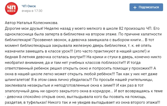 Прозвенел звонок, а девочка замешкалась с выбором книг… В тот момент библиотекарша закрывала железную дверь библиотеки <...> и бедная 8-летняя девочка осталась внутри, — написала автор публикации.