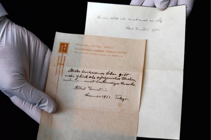 На аукционе в Иерусалиме были проданы записки Альберта Эйнштейна, в которых ученый поделился мыслями о том, что такое счастье и жизнь. Записи были сделаны почти 100 лет назад, когда в 1922 году 43-летний ученый прибыл в Японию для выступления с лекциями.