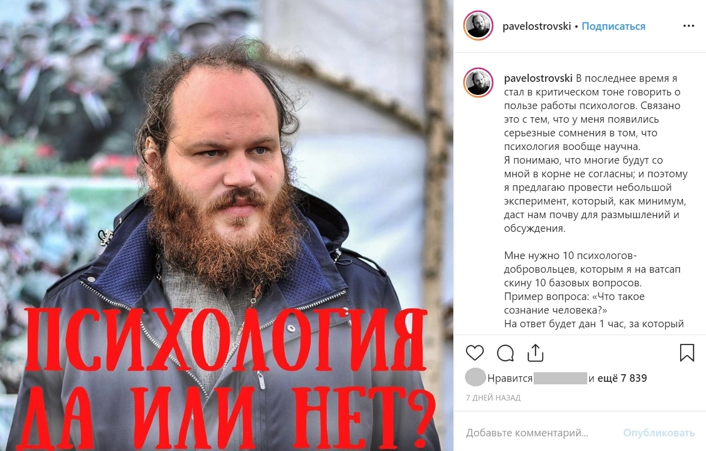 В одном из предыдущих постов он также написал, что сомневается в том, что психология имеет отношение к науке. Павел Островский предложил психологам пройти тест — он пришлет им вопросы, а они должны будут ответить в течение одного часа.