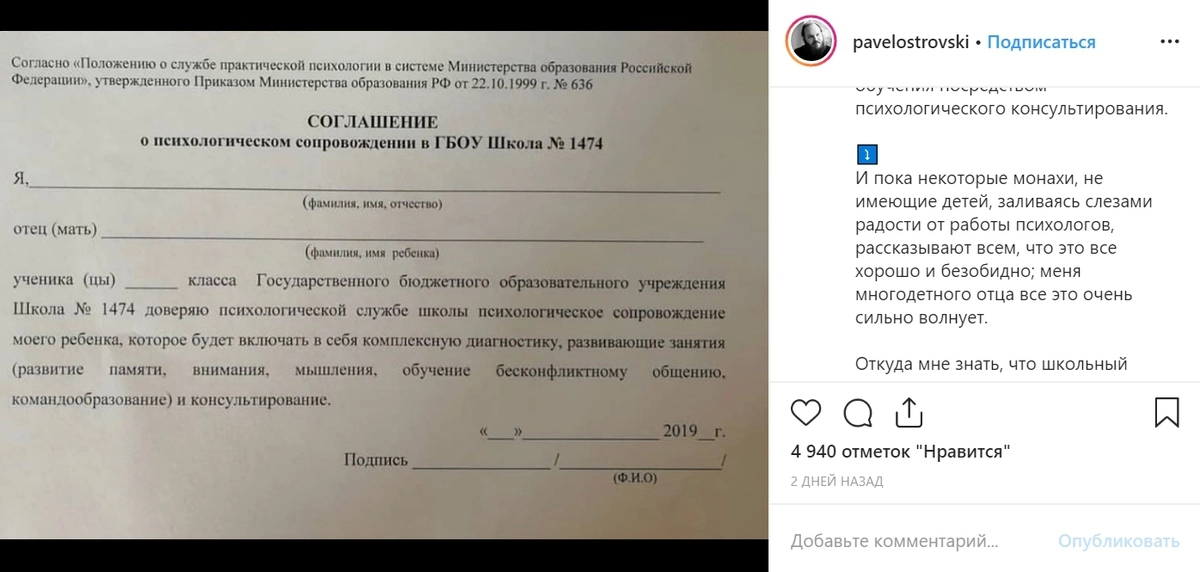 Своим мнением Островский поделился в Instagram, где опубликовал скрин соглашения о психологическом сопровождении в школе, которое ему прислала подписчица.