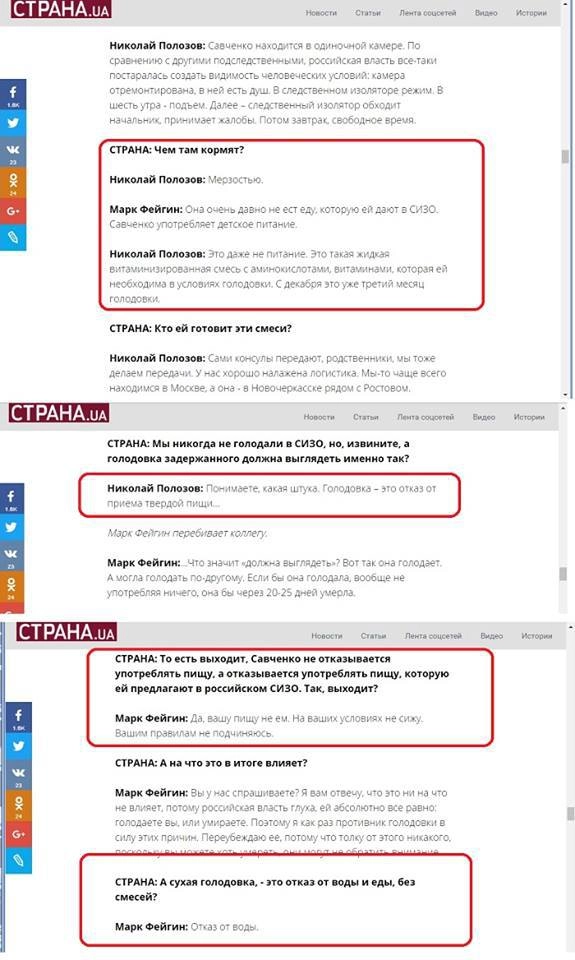«Савченко употребляет детское питание», — рассказал в интервью изданию «Страна» юрист Марк Фейгин.