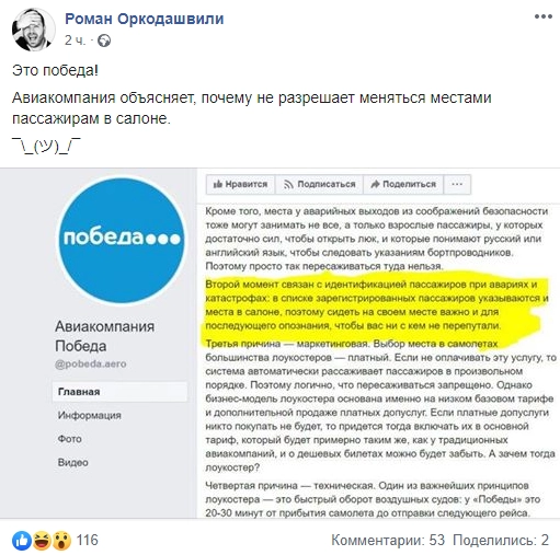 Ранее «Победа» разместила на своей официальной странице в Facebook пост, в котором объяснила, почему в салоне самолета нельзя пересаживать пассажиров на соседние кресла: это нужно для удобства идентификации при авариях и катастрофах.