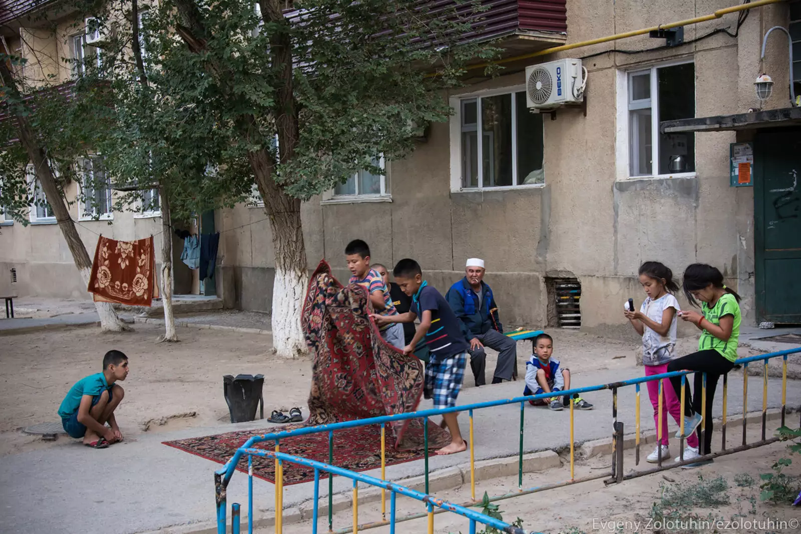 Развлечений в Байконуре особо никаких нет, поэтому молодежь просто гоняет мяч по песку во дворах старых советских домов.