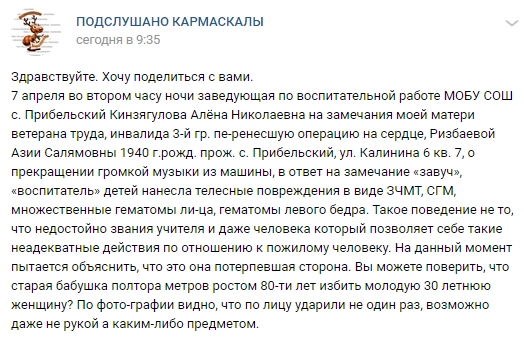 Как сообщила в соцсети «ВКонтакте» дочь пенсионерки, ее мать сделала замечание о громкой музыке из машины, в которой находилась завуч школы. Та в ответ на просьбу пожилой женщины прекратить шум нанесла ей телесные повреждения, включая сотрясение мозга, закрытую черепно-мозговую травму, а также множественные гематомы лица и левого бедра. Следы травм на лице видны на фото.