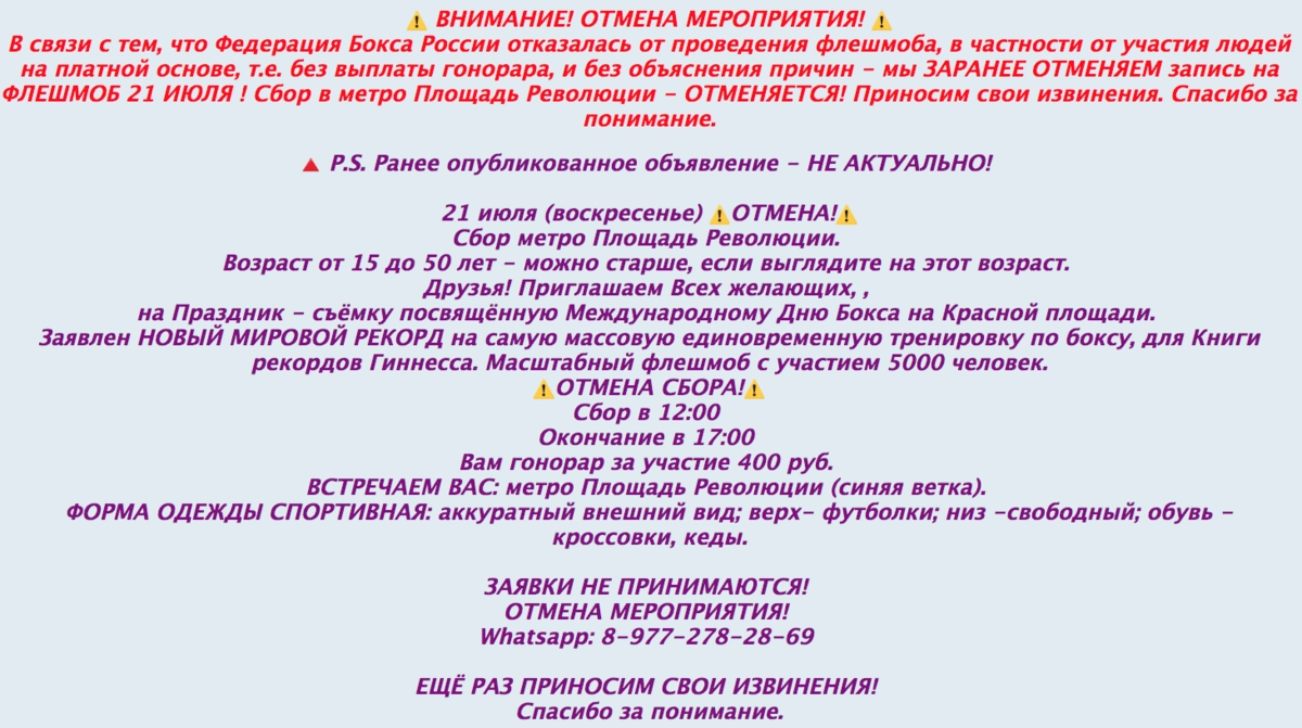 На сайте с объявлениями о найме актеров массовки действительно шла регистрация участников флешмоба, каждому из которых обещали гонорар в размере 400 рублей. Впрочем, после того, как эти детали стали активно распространять в Сети, Федерации бокса России пришлось «свернуть» проект:
