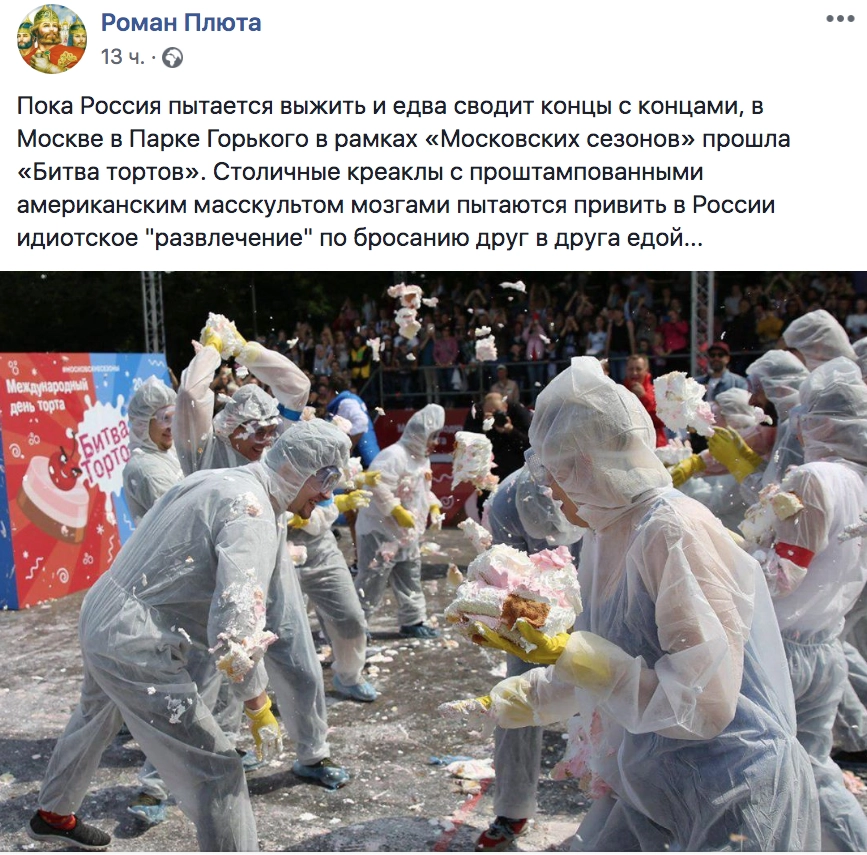 У собянинцев какие-то проблемы с понятием допустимости. Как у Марии-Антуанетты незадолго до революции и казни. Битва тортов в Парке Горького. Развлечение от мэрии. Я вроде не голодаю, но с детства мне твердили: с едой не играют. И это в стране с зашкаливающим количеством бедных, где даже в сытой Москве люди роются в мусорных баках. И зашкаливающее дурновкусие: «Ах, он упал в торт! Как смешно», — пишет в Instagram irinahudakova.