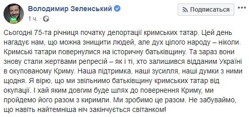 Я верю, что мы освободим родину крымских татар от оккупации. И пусть каким бы долгим ни был путь к возвращению Крыма, мы пройдем его вместе с кырымлы (крымские татары — прим. «Ридуса»). Мы сделаем это вместе. Не забывайте, что даже самая темная ночь заканчивается рассветом, — написал Зеленский в Facebook.