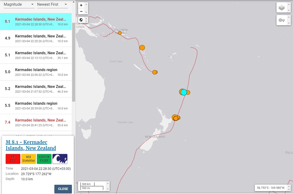 Целая серия землетрясений произошла 4 марта в районе глубоководного желоба Кермадек у берегов Новой Зеландии. Седьмой по счету подземный толчок был самым мощным — его магнитуда оценивается в 8,0. Объявлена угроза цунами.