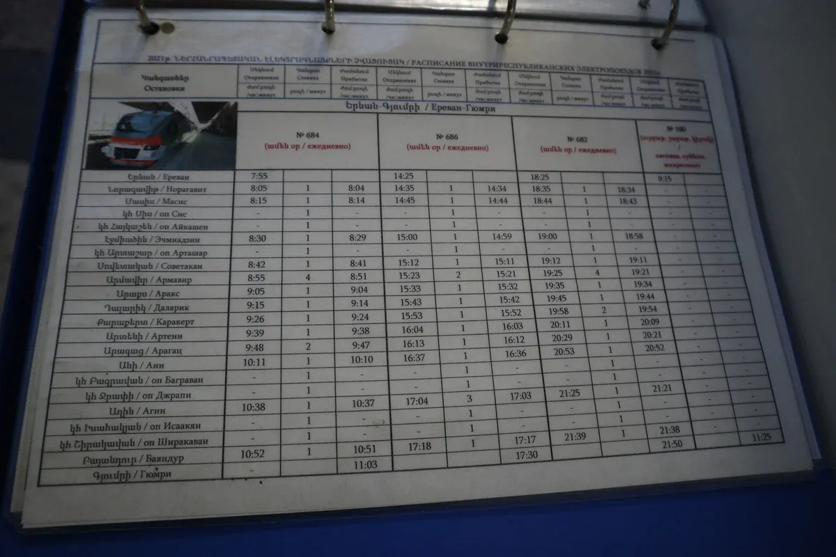 Всё сообщение представлено 4 парами поездов в Гюмри, 1 парой — в Аракс (по пути в Гюмри) и 1 — в Ерасх (на юг от Еревана). Пригородного сообщения дальше Гюмри — нет!