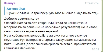 Зарема Салихова — жена президента и совладельца футбольного клуба «Спартак» Леонида Федуна — ответила в своем Telegram-канале на вопрос болельщиков, видит ли она Станислава Черчесова на посту главного тренера красно-белых.
