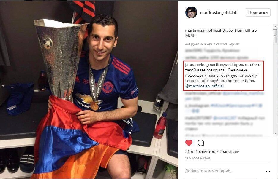 Мартиросян опубликовал фото Генриха с кубком. Пока подписчики юмориста восхищались игрой футболиста, супруга Мартиросяна Жанна Левина обратила внимание на «вазу» в руках у спортсмена.