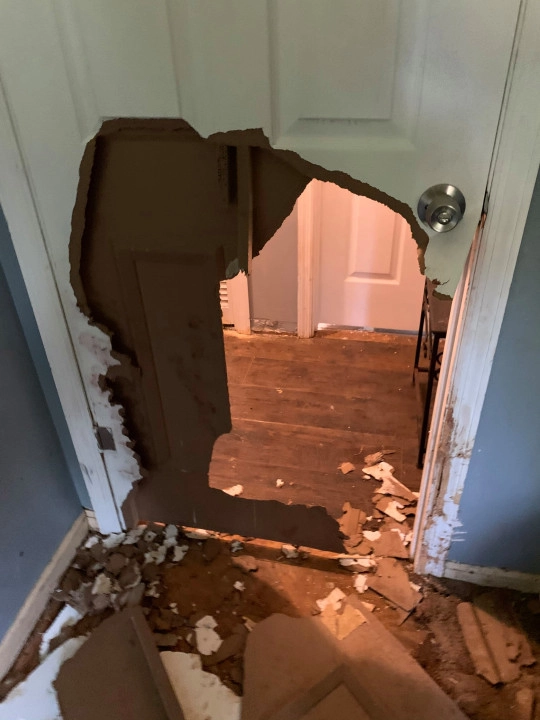Я включила ему телевизор с успокаивающими звуками, разложила игрушки и надеялась, что он будет вести себя как хороший мальчик. Но когда я вернулась, Бо ждал меня у входной двери. Я сразу поняла, что дело плохо, и не ошиблась. В двери в комнату сына зияла огромная дыра.