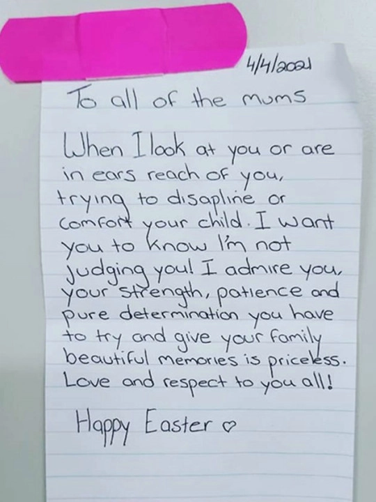 Всем мамам! Я хочу, чтобы вы знали, когда я смотрю на вас или слышу, как вы пытаетесь дисциплинировать и утешить своего ребенка, я не осуждаю вас. Я восхищаюсь вами. Ваша сила, терпение и решимость, с которой вы пытаетесь подарить своей семье прекрасный отдых, бесценны. С любовью и уважением ко всем вам. Счастливой Пасхи! — говорилось в записке.