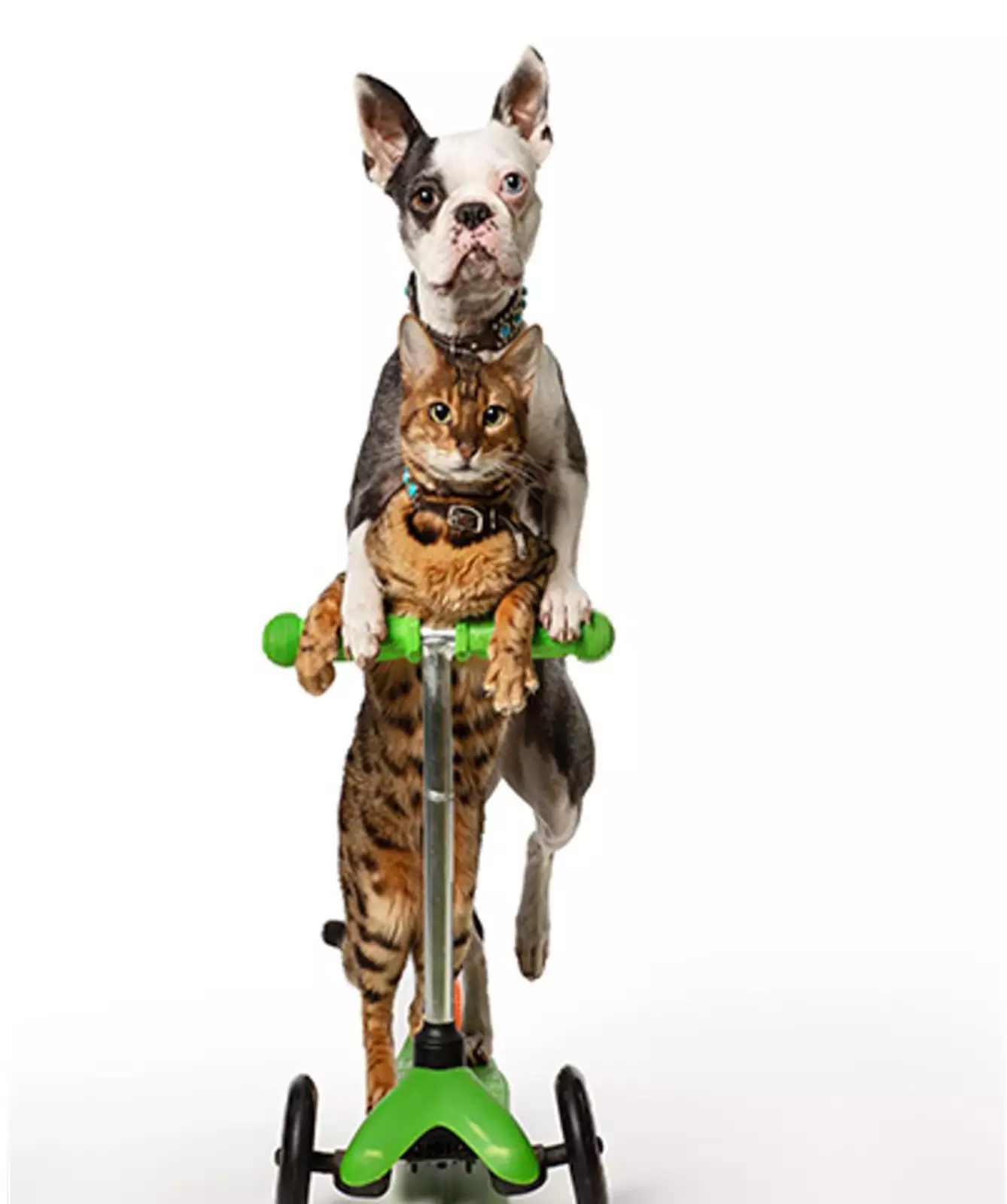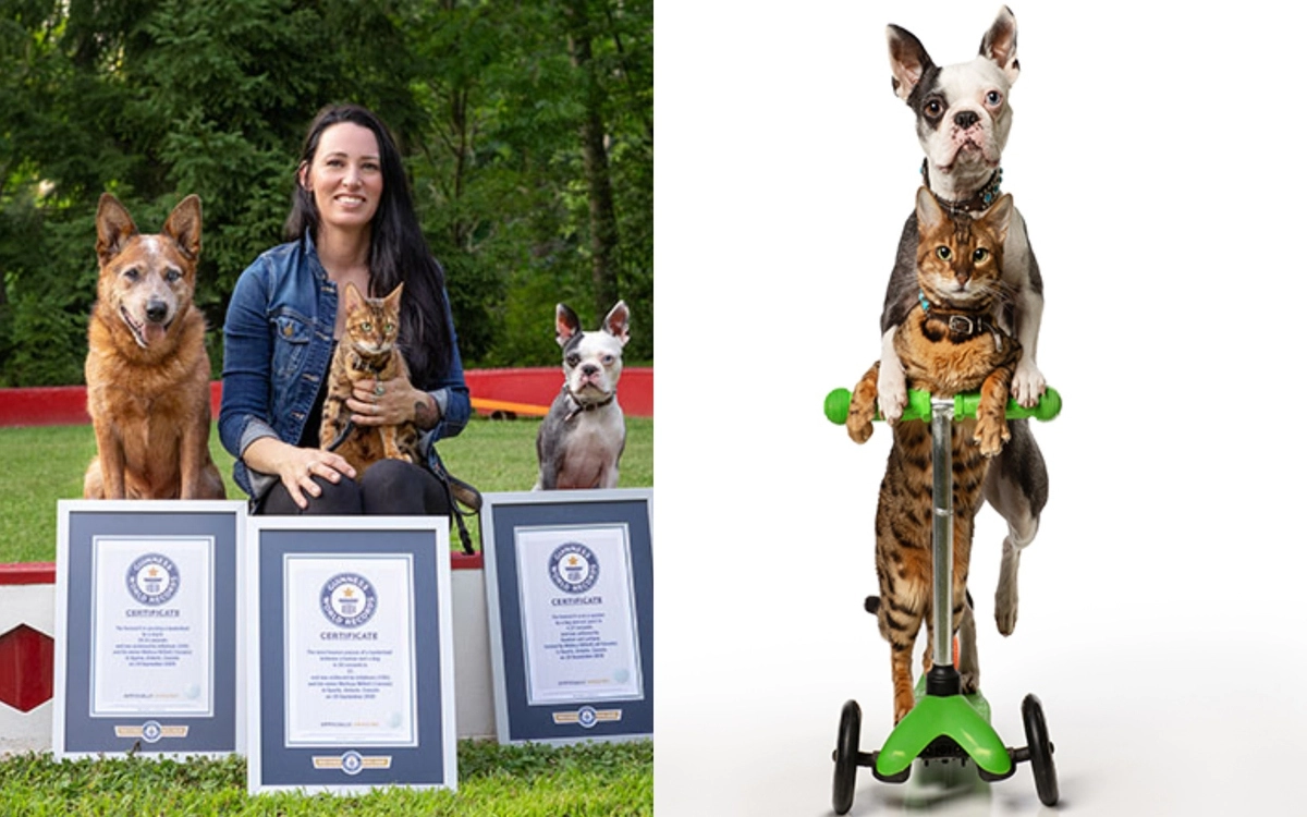 40-летняя профессиональная дрессировщица собак из Онтарио (Канада) по имени Мелисса Миллетт учит своих питомцев не только подавать лапу и лаять по команде, но и выполнять разные интересные трюки. Например, ее домашние любимцы — бенгальская кошка Сашими и глухой бостон-терьер Леденец умеют кататься на самокате и делают это одинаково хорошо как поодиночке, так и в тандеме.